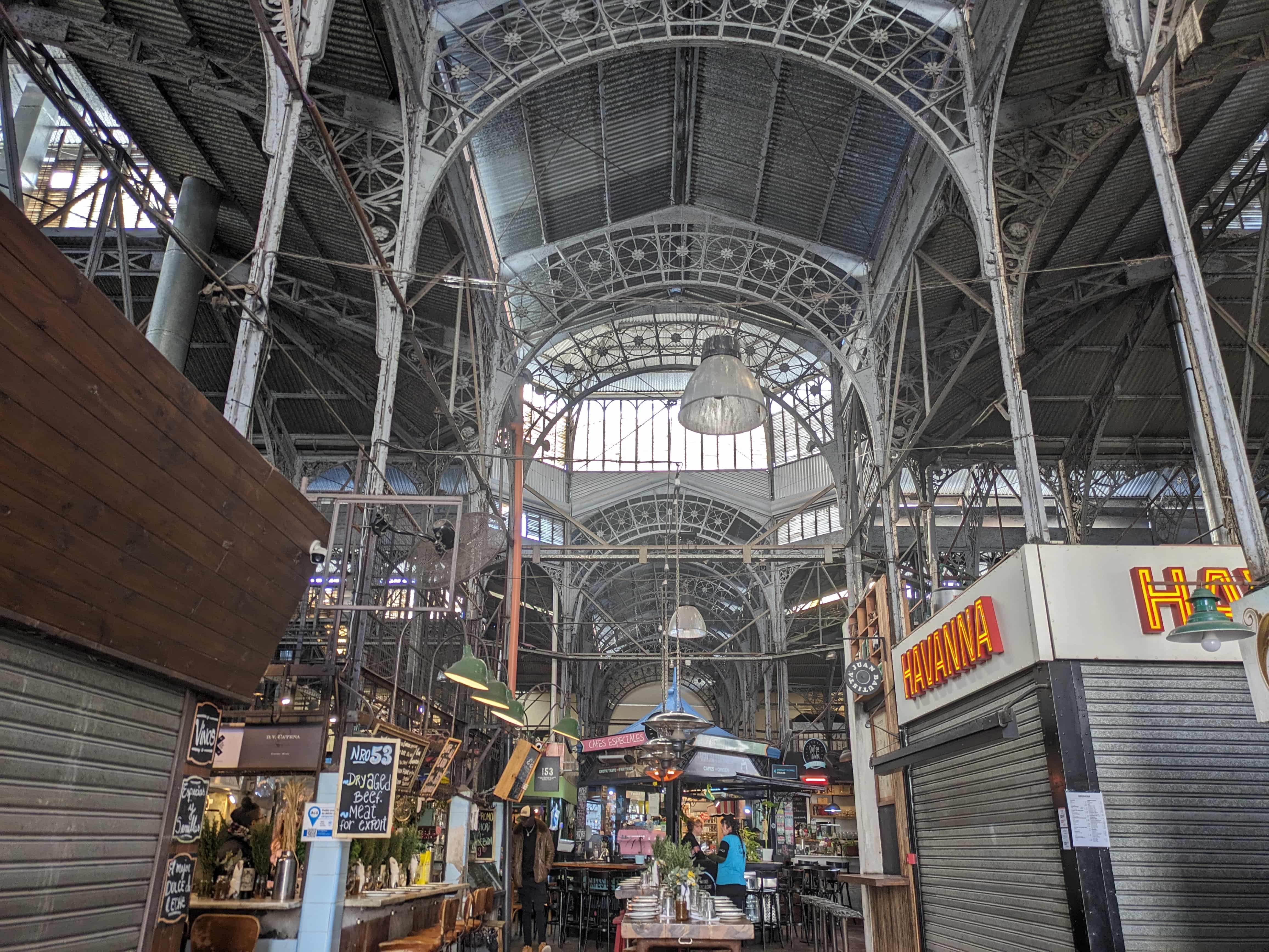 市場内は鉄骨構造で、歴史的な雰囲気が感じられます。食品からお土産、アンティークまで多様な商品が並んでおり、地元の文化を感じることができました。