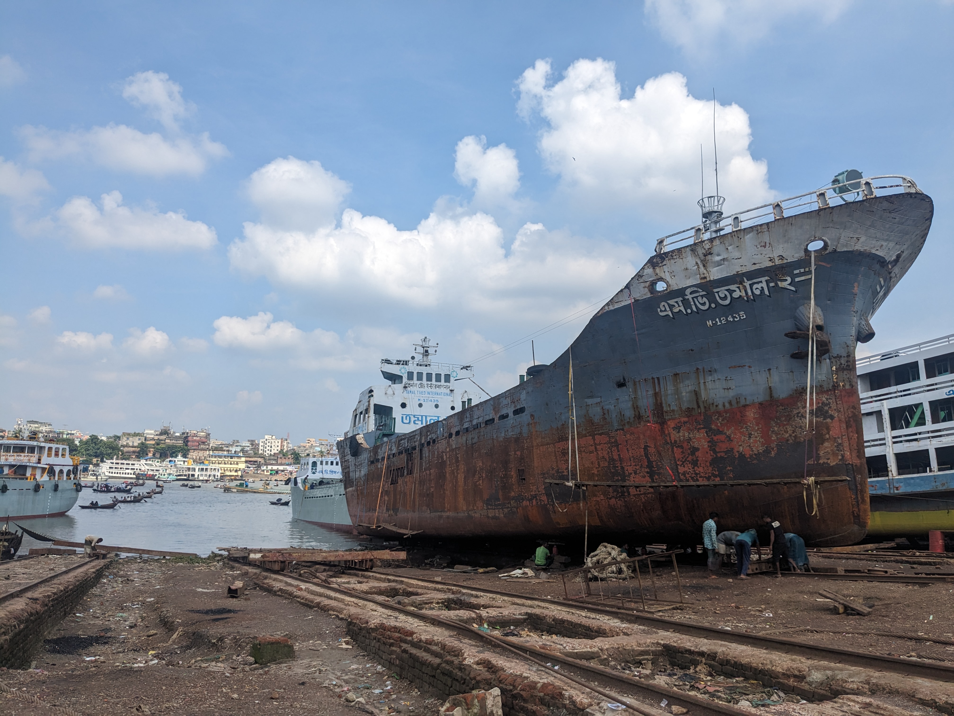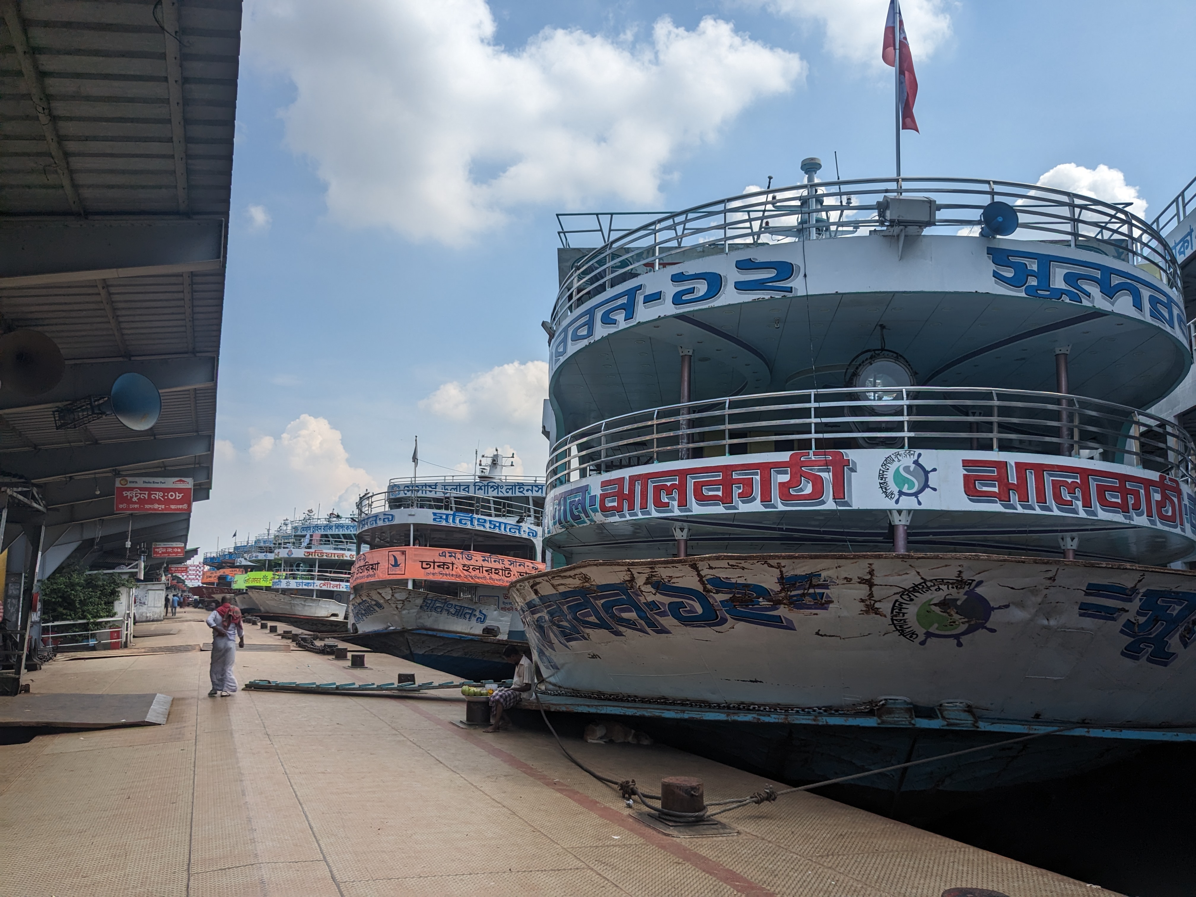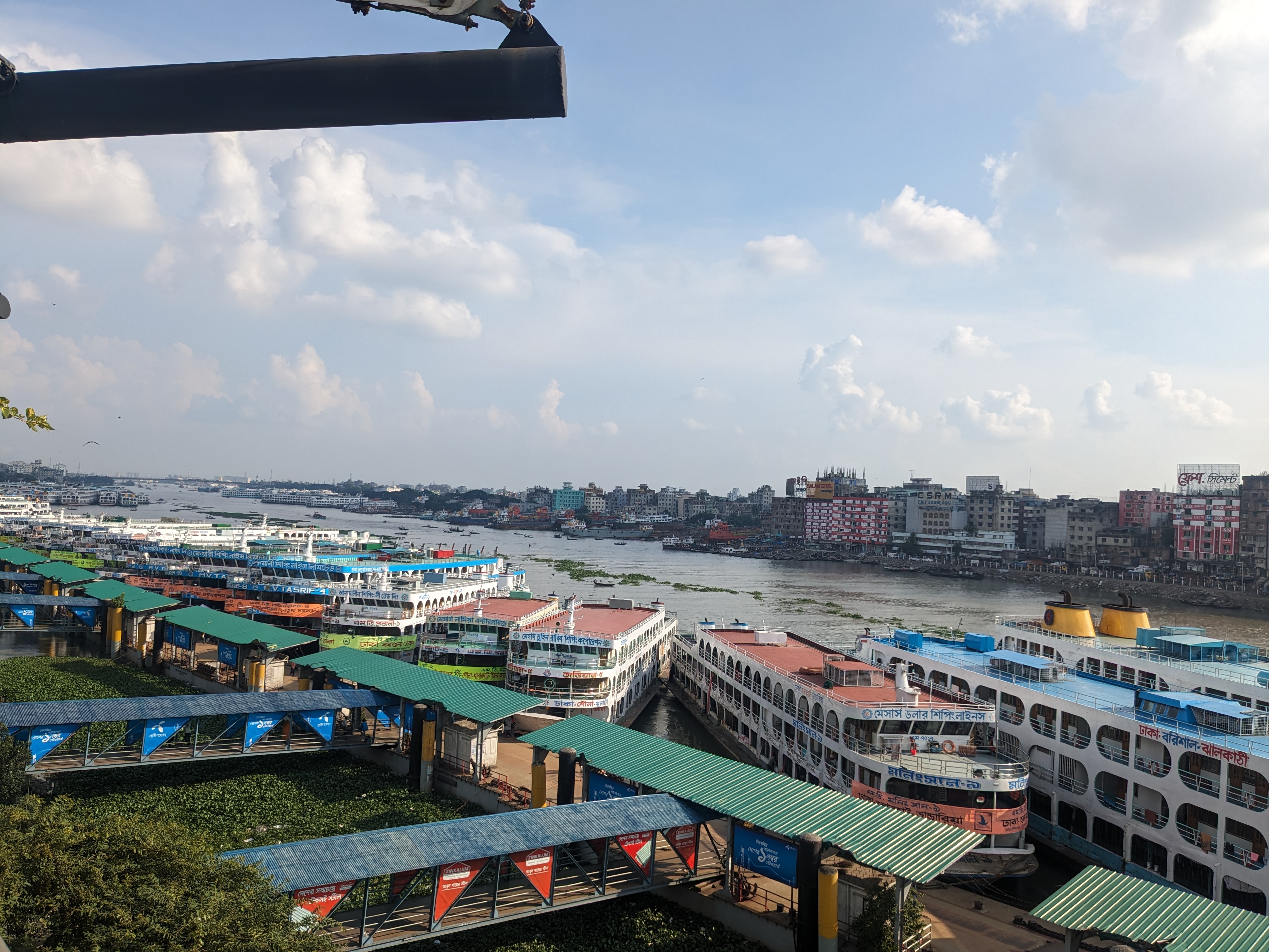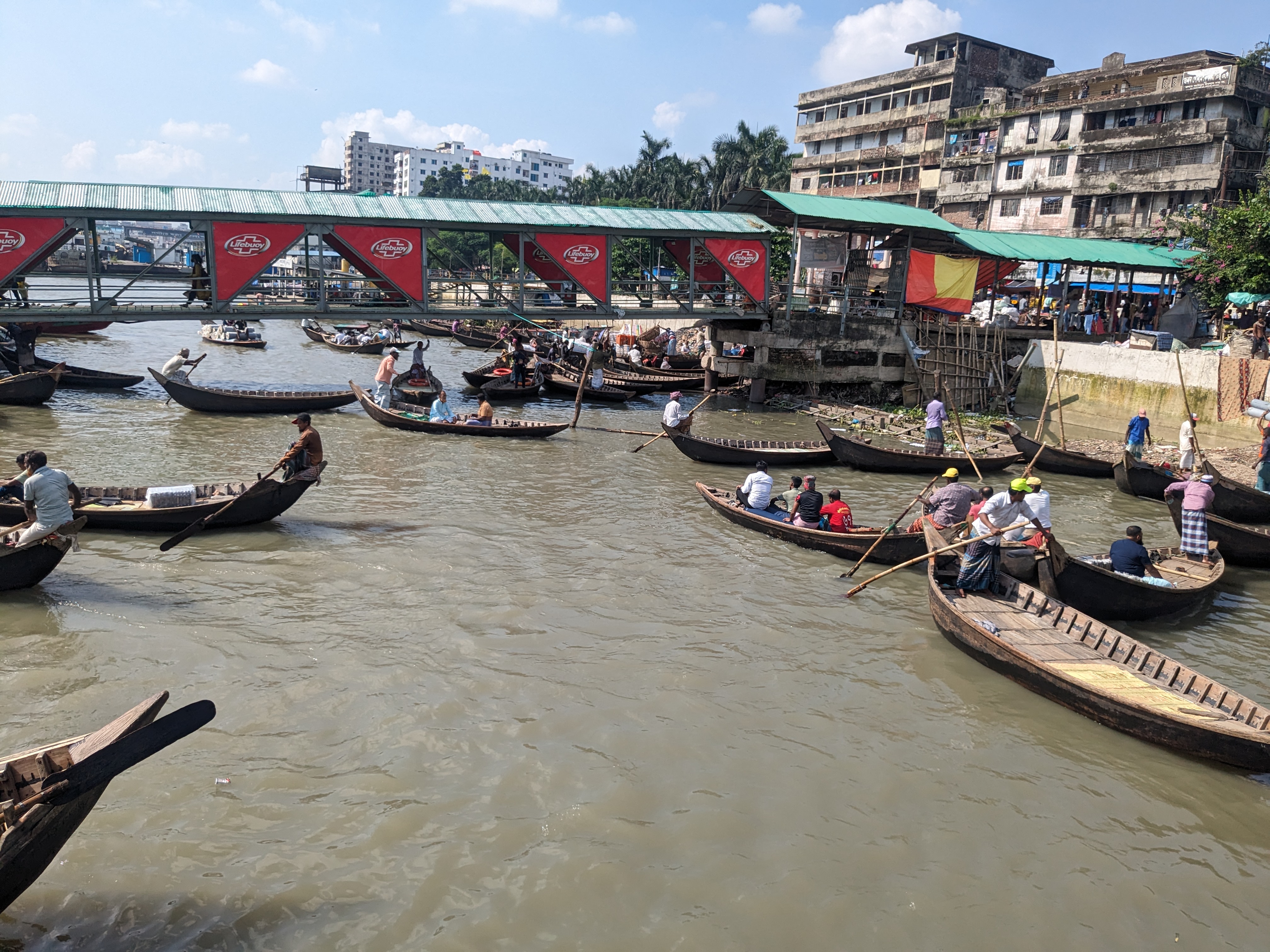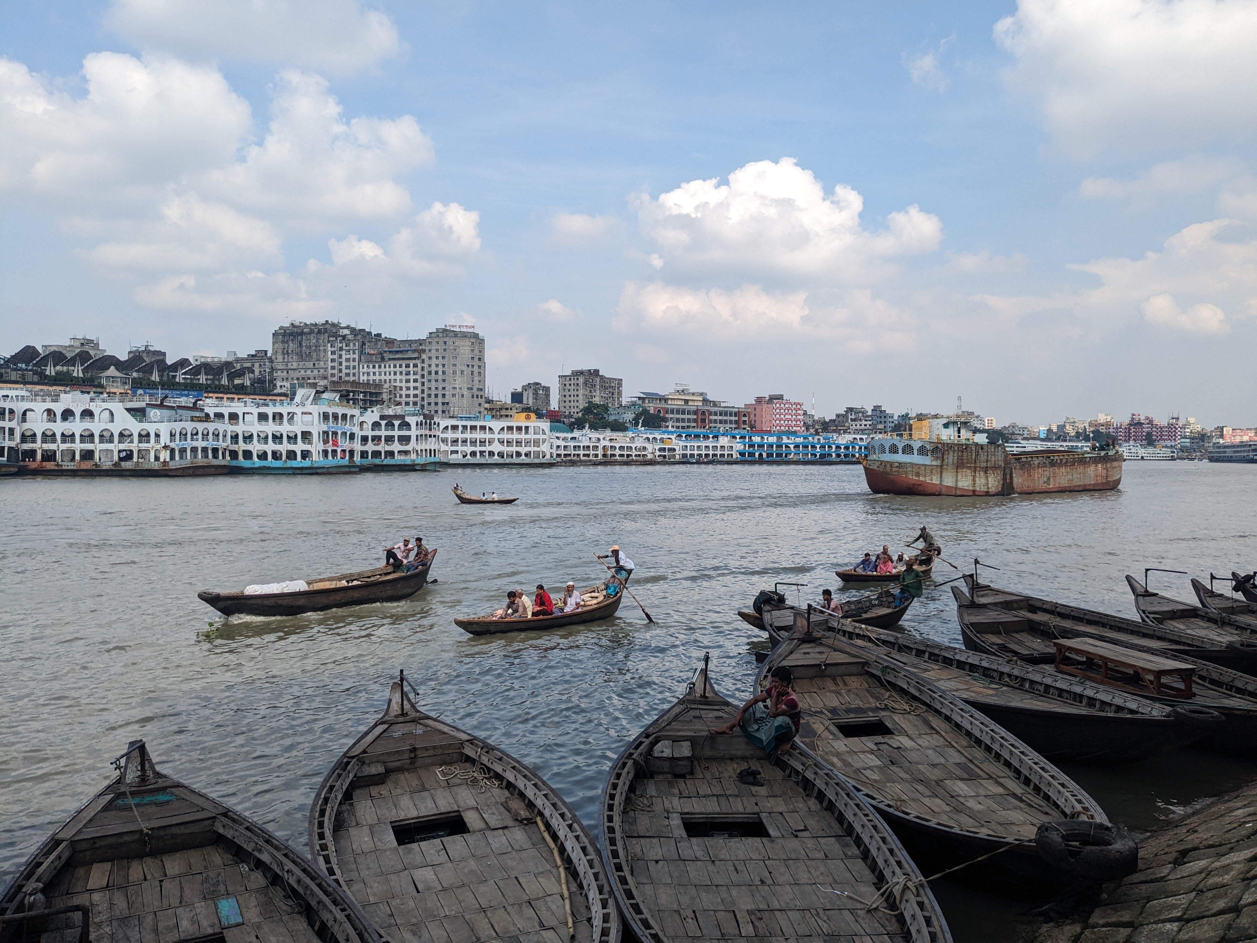 ベンガル文字が書かれた船がたくさんあり、これぞバングラデシュという雰囲気の景色を見ることができます。