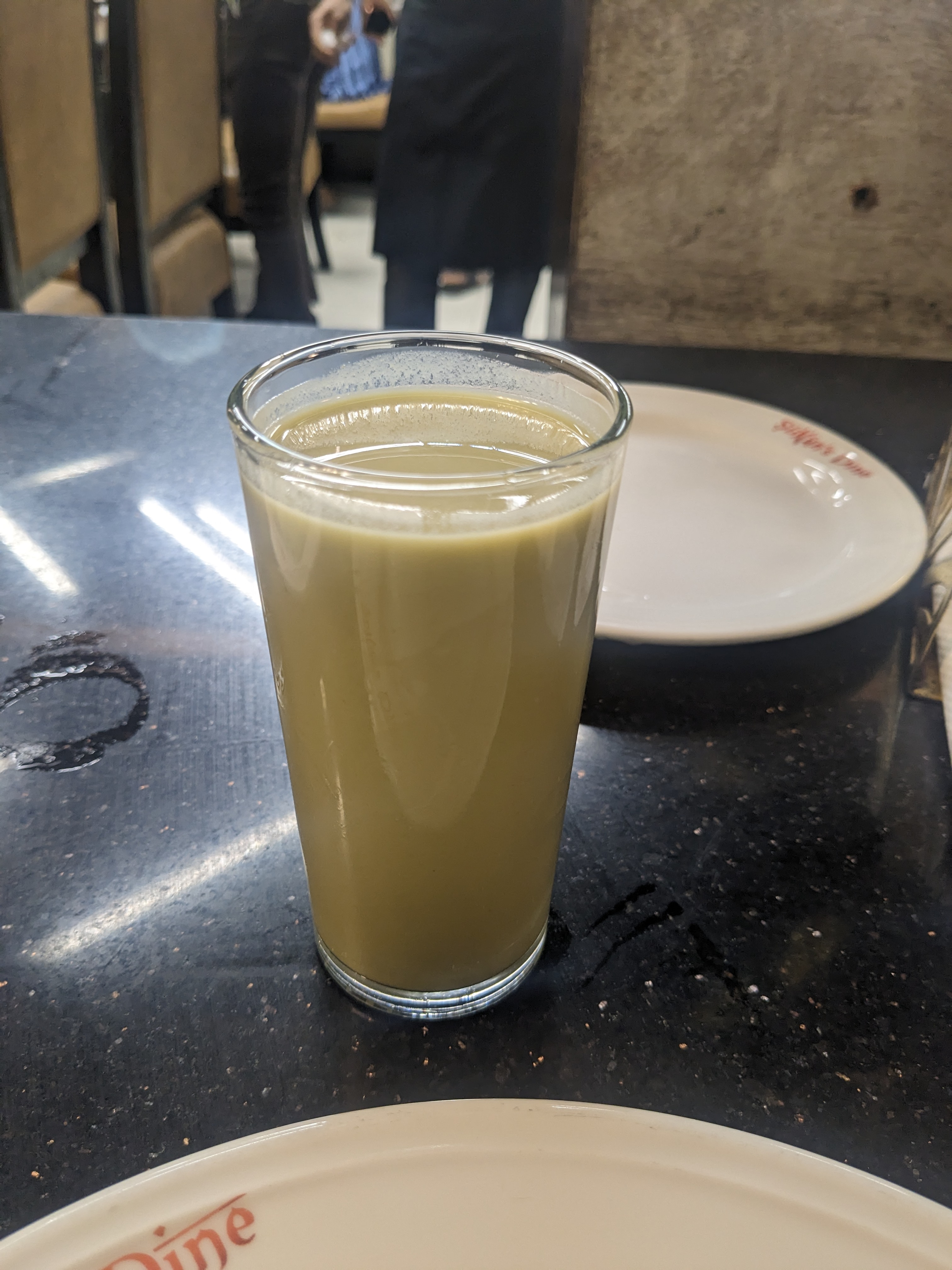 ヨーグルトとミントや唐辛子を混ぜた飲み物で、酸味や辛みが混ざり合い、説明が難しい味です。