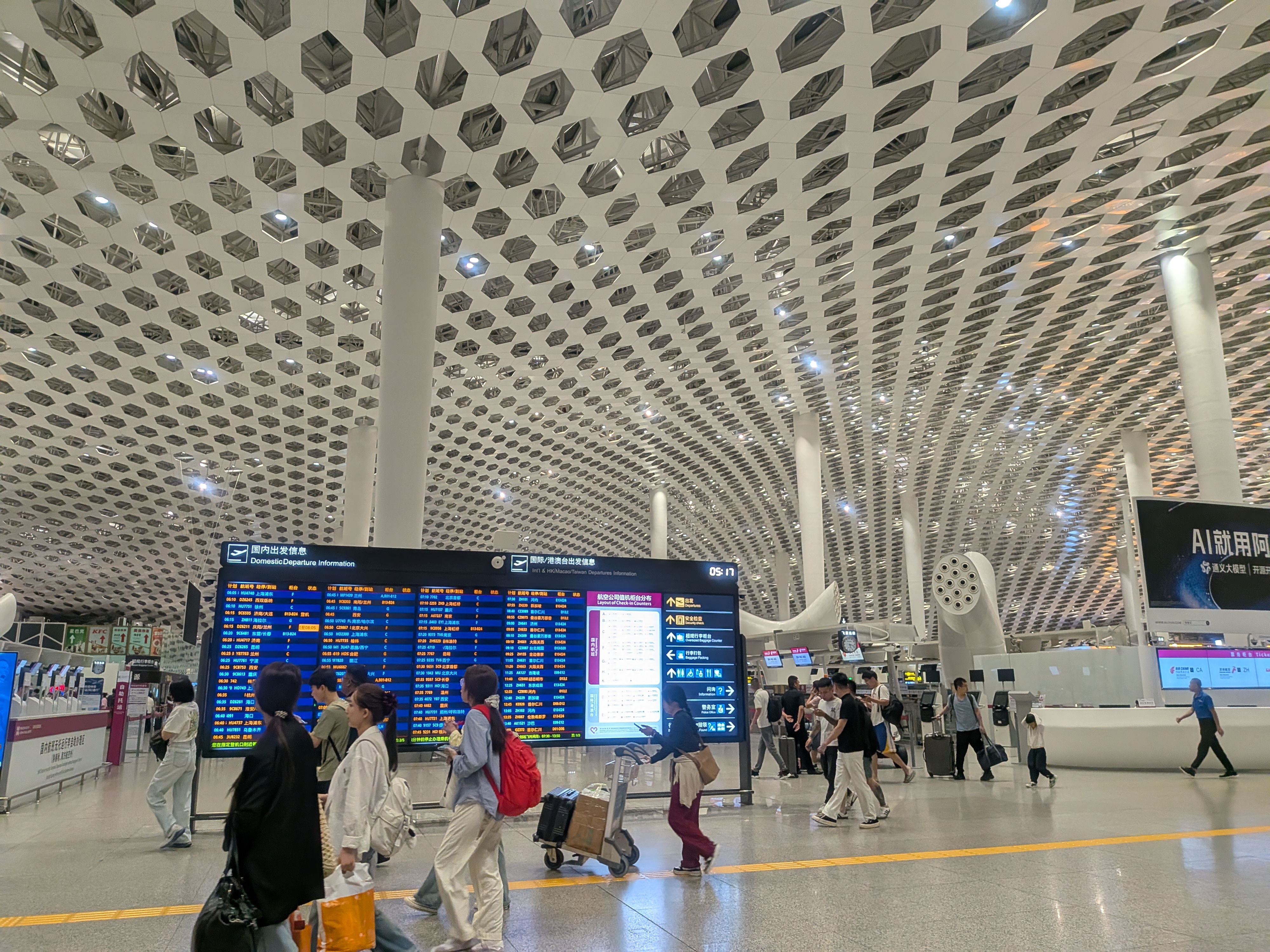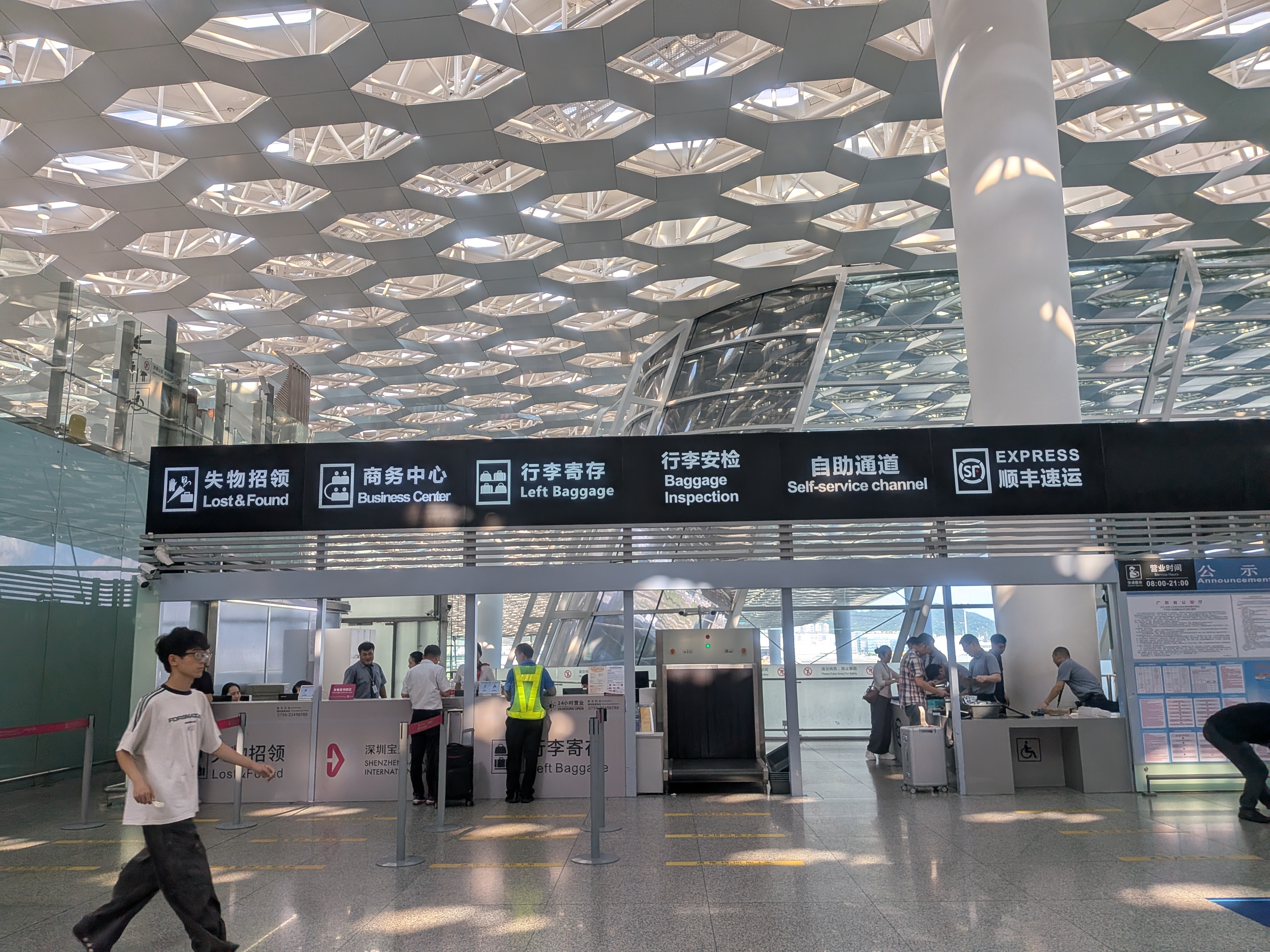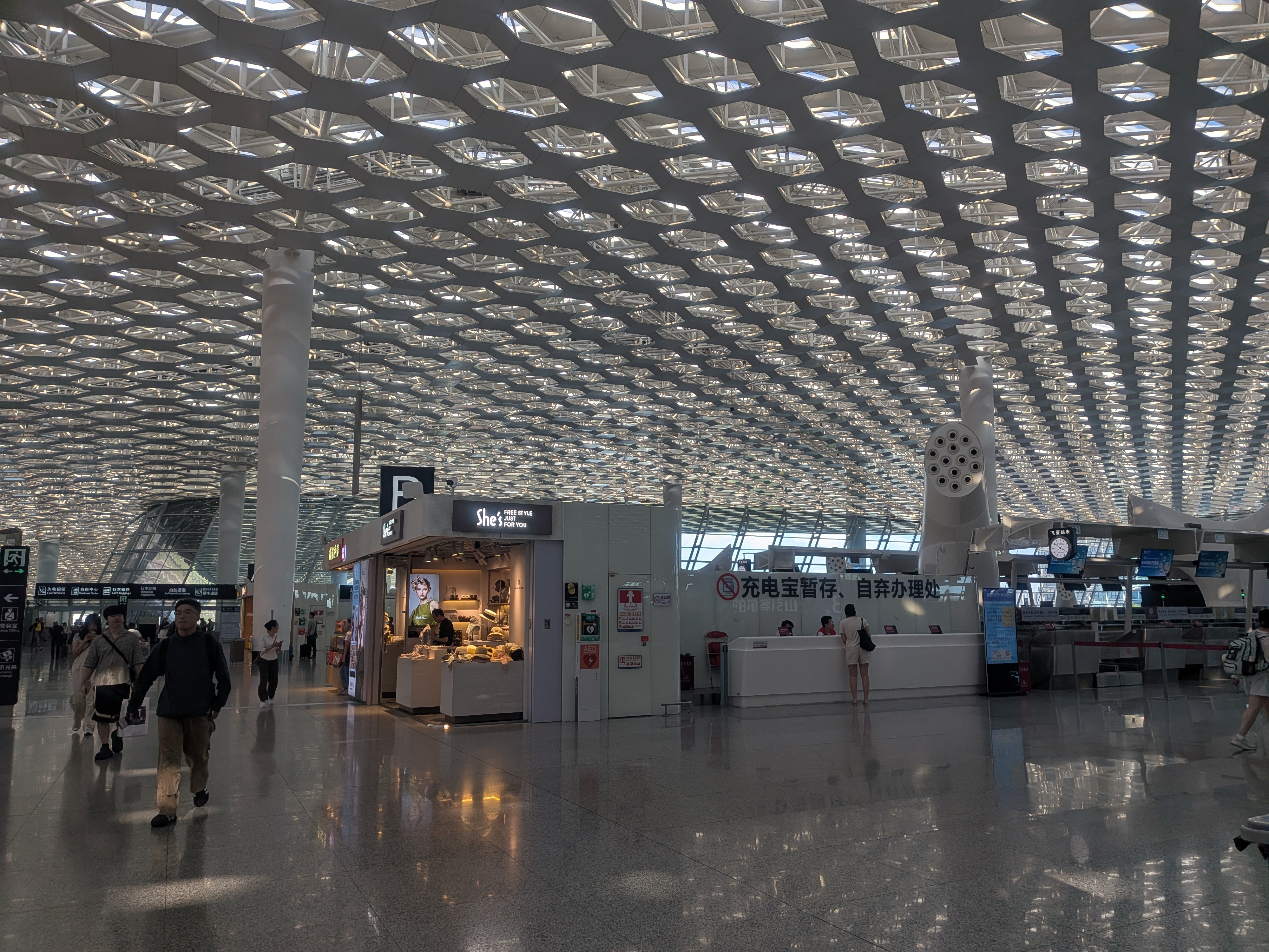 深圳国際空港に到着したら、入国審査、荷物受取まで済ませ、「出国」フロアの E24 カウンターを目指しましょう。